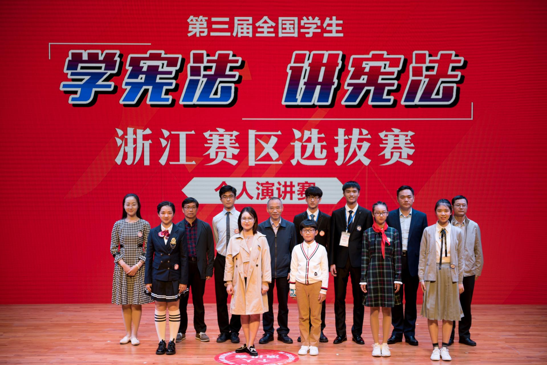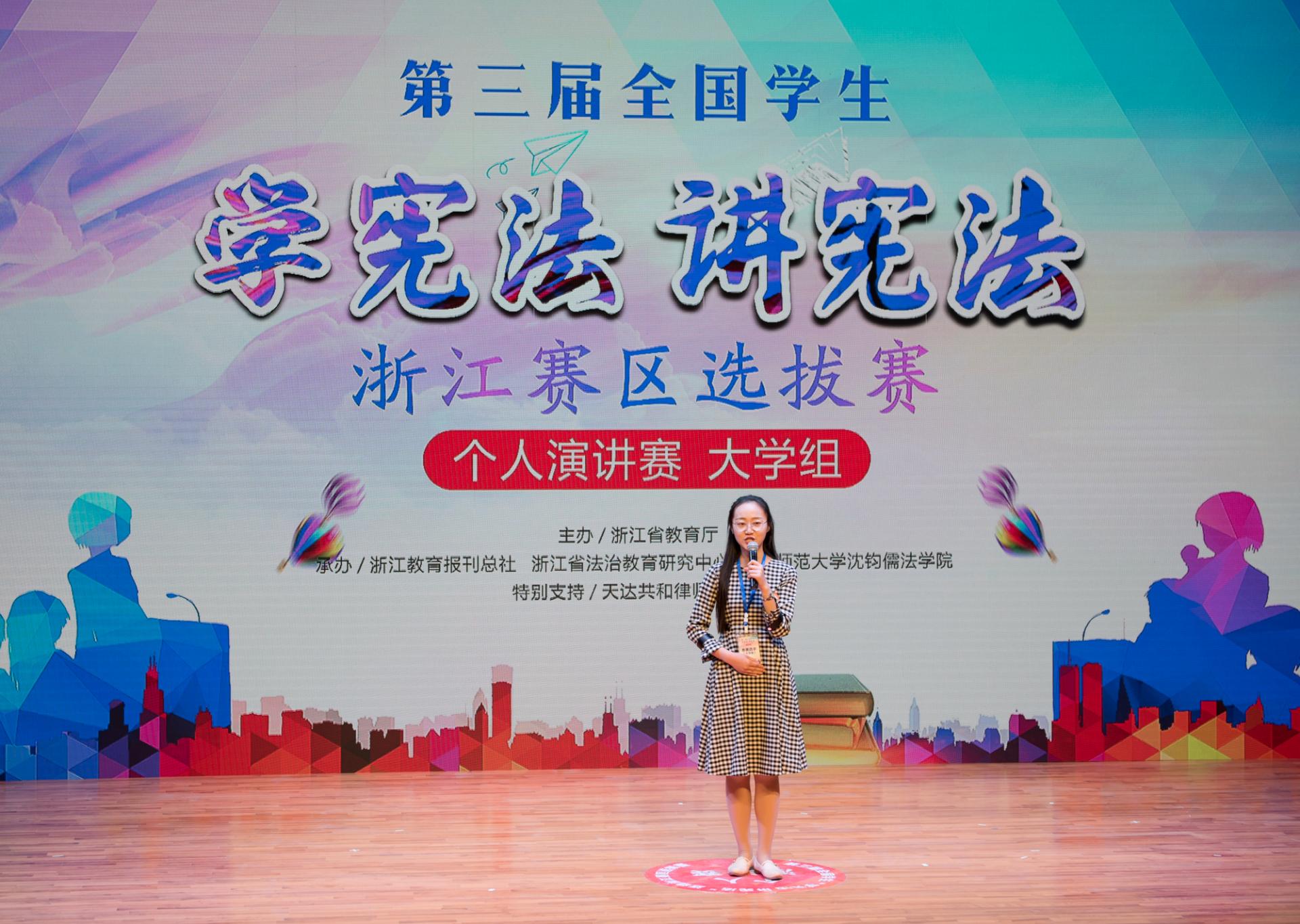 参加比赛。比赛中,吴佳慧以“从法治浙江看法治中国”为主题,揭示了《宪法》在全面推进依法治国中的地位和作用,探索了《宪法》在浙江发展中的实施路径。饱满的感情、流利的表达、较强的现场感染力,让吴佳慧同学在所有选手中脱颖而出,获得第二名的好成绩。比赛前期,唐勇老师担任指导,负责甄别选题、修改演讲稿、指导演讲仪态与礼仪等。