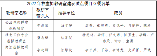 经学院推荐,校专家组评审,学校确定立项2022年校级虚拟教研室建设试点项目12个。在线漫画 “公法课程群虚拟教研室”、“商法虚拟教研室”、“社会工作专业虚拟教研室”获立项。