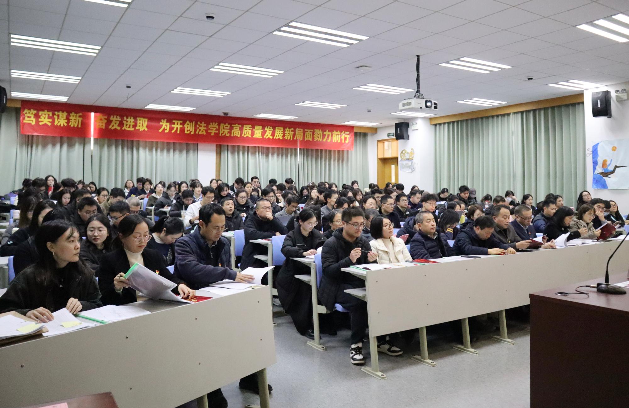 高质量发展新局面勠力前行》的党委工作报告。报告全面总结回顾了学院党委近四年来在坚持党的核心引领、提升基层组织战斗力凝聚力、加强学科建设、优化师资队伍、强化人才培养特色、积极服务法治实践等方面所取得的成绩,并从党建工作提质创优、事业发展齐驱并进、和谐学院共建共享三个方面提出了今后四年党委工作的思路和方向。