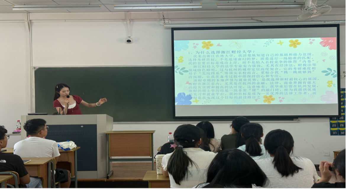 的学习体验。在经验分享环节,洪宇帆和梁宇杭同学分别从择校策略和备考方法等角度提供了具体建议,包括如何根据个人发展规划选择适合的研究生方向,以及如何在备考过程中保持良好心态和学习效率。互动环节中,学生们积极提问,问题涉及备考技巧、专业选择、复试准备等多个方面,宣讲团成员逐一给予耐心解答,现场交流充分。