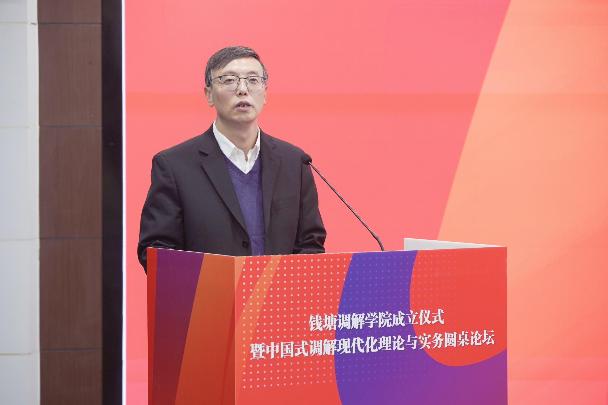 沈燕俊对钱塘调解学院的成立表示热烈祝贺。他指出,成立钱塘调解学院,是钱塘区坚持和发展“枫桥经验”,整合政法实践与高校资源,区校合作推进平安建设、法治建设的重要探索。希望钱塘调解学院聚焦打造“育人高地”,围绕重点领域开发专业化培训体系,搭建“研究平台”,围绕新时代调解工作的新规律、新机制,加强学术交流合作,建设“实践窗口”,推动教学研用深度融合,打造具有影响力和辨识度的调解品牌,真正成为赋能基层治理的支撑平台。