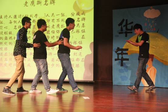 为活跃晚会的气氛,主持人宣布进行游戏,以老鹰捉小鸡的形式进行撕名牌比赛,共有六名成员参加,三人一组进行比赛,大家在游戏中的奋力拼搏,同时观众席爆发出一阵阵的笑声和掌声。