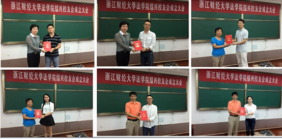 绍兴校友会理事,绍兴市柯桥区财政局任职的首届毕业生张栋栋校友(98经济法班)当选荣誉会长,绍兴文理学院元培学院的金超校友(00民商法班)当选会长,浙商银行绍兴分行张琼文(99法学一班)、浙江新昌农村商业银行股份有限公司吴初成(00经济法班)、上虞农村合作银行徐浩锋(01经济法班)、绍兴市柯桥区委办公室沈海风(01民商法班)、诸暨市国土资源局陈杰荣(01民商法班)、绍兴烟草公司嵊州分公司吕旭辉(06经济法班)、绍兴中级人民法院高晶晶(06民商法班)为副会长,选举泰隆银行绍兴分行魏高明(07法务会计)为秘书长、泰隆银行绍兴分行陈林(09法学三班)为副秘书长。罗金艳、李春燕、王俊等老师向新当选校友颁发聘书。