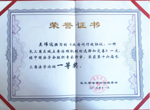 本次论坛,中国法学会通过双向匿名评审,从递交的860篇论文当中评出了获奖论文40篇,其中一等奖5篇,二等奖12篇,三等奖23篇。吴伟达教授提交的论文《政府间行政协议:一种长三角区域主要治理机制的选择和完善》获一等奖。