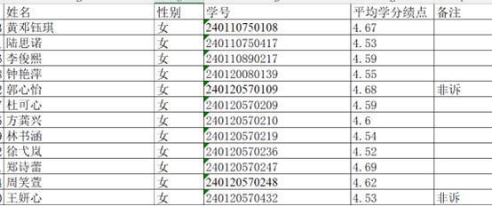 依照学生报名情况,按照男生组1:3比例和女生组1:3比例组织学生面试,即按入学来所有课程平均学分绩点排序,各选择报名学生的前12名进入面试(男生组9人报名,2人不符合报名条件,故剩下7人全部进入面试)。面试顺序按学号升序排序(具体见截图)