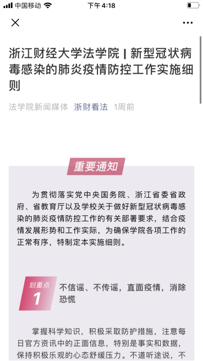 学院微信公众号“浙财看法”定期推送,宣传科学防控知识,引导师生理性认识疫情,科学做好防护。对排摸到的医学隔离人员以及有疫区旅行史、接触史等情况的师生,做到实时登记入库,各党支部书记更是每天一对一进行联系跟进。