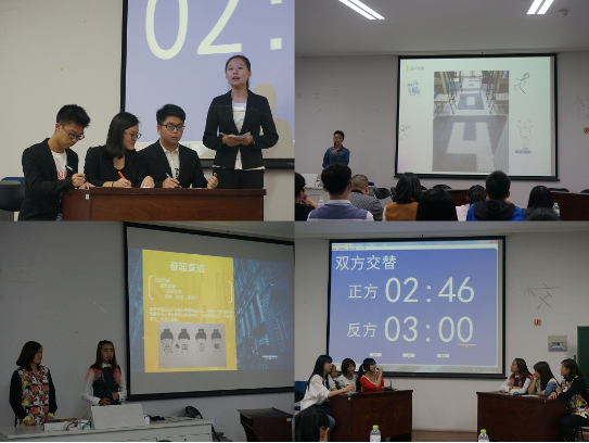 接下来主持人宣布比赛规则后,各寝室按照抽签顺序分为五组,两两一组。每个组寝室都围绕“一本书、一句话、一件事”带给寝室的“学会学习、学会做事、学会做人”的成长体验的主题,先以PPT的形式分别展示关于寝室风采、寝室共同生活经历以及寝室成长体验。在寝室各自的介绍中,话题围绕“室友相处之道、寝室活动开展、寝室卫生管理、寝室学习氛围营造”等方面。然后是每组的辩论环节,通过回答对方辩手以及评委老师的提问,各组分别阐述了自己的观点,24幢316寝室就评委老师的提问介绍了寝室共同总结的平衡学习与娱乐的心得;24幢323寝室重点讲到如何处理寝室关系,怎样以包容之心面对矛盾。