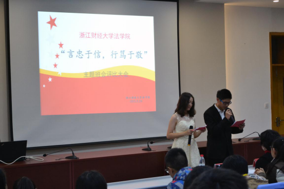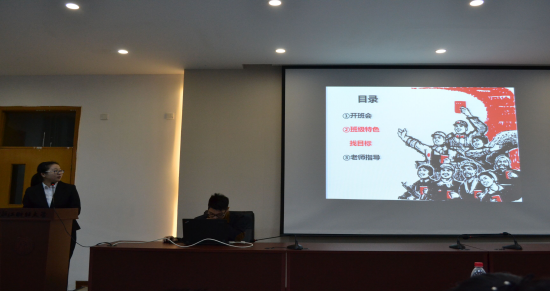 第一部分,现场宣讲。参赛班级按照抽签顺序依次上台进行ppt展示及就本班学风建设主题班会开展情况进行演讲,评委根据情况进行打分,总分为80分。首先上台的是13法学2班,其演讲的题目是“让学习像Wi-Fi一样迷人”。别出心裁的题目,具有班级特色的演讲,赢得了大家热烈的掌声。随后,13、14、15级各班学生代表依次向大家解说了班会的开展背景、开展情况、班级特色、班会总结等多个方面的情况。
