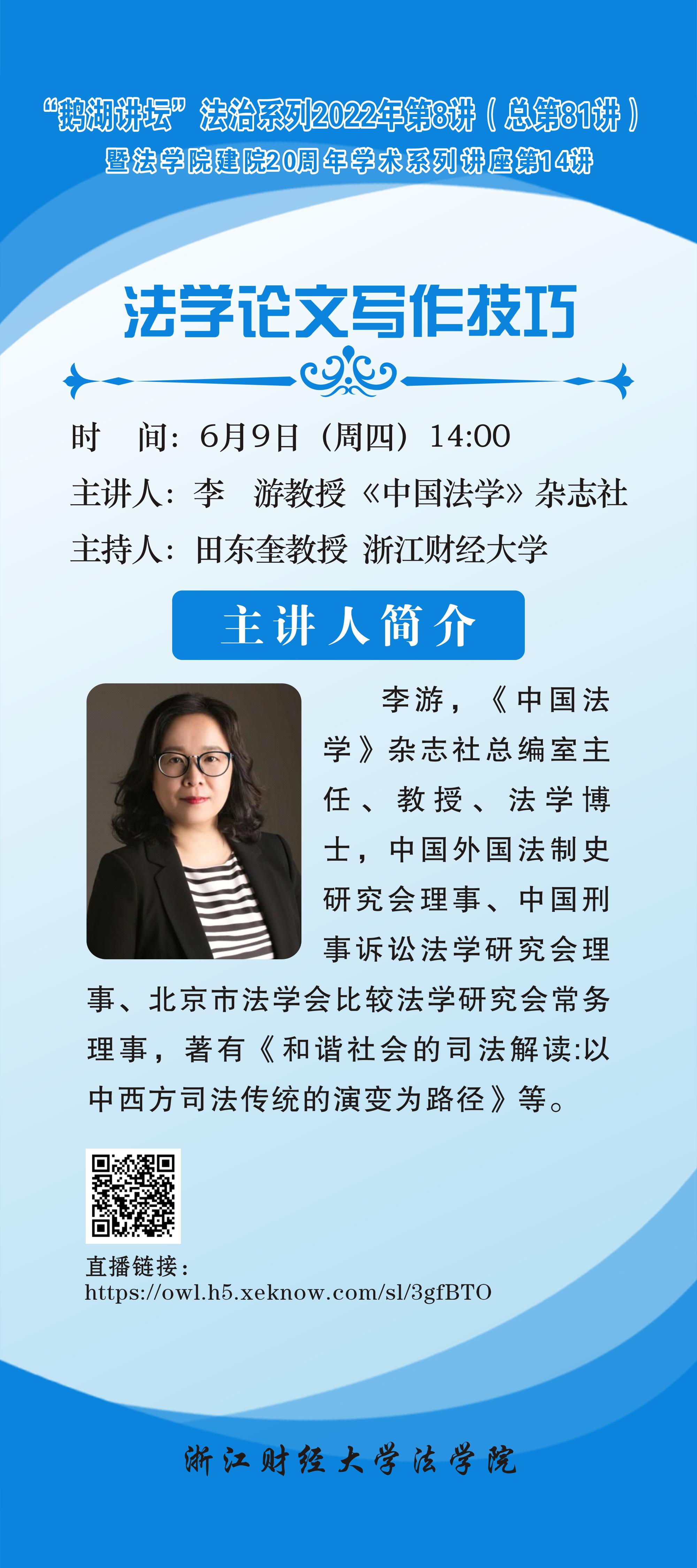 “鹅湖讲坛”法治系列2022年第8讲暨在线漫画 建院20周年学术系列讲座第14讲李游教授