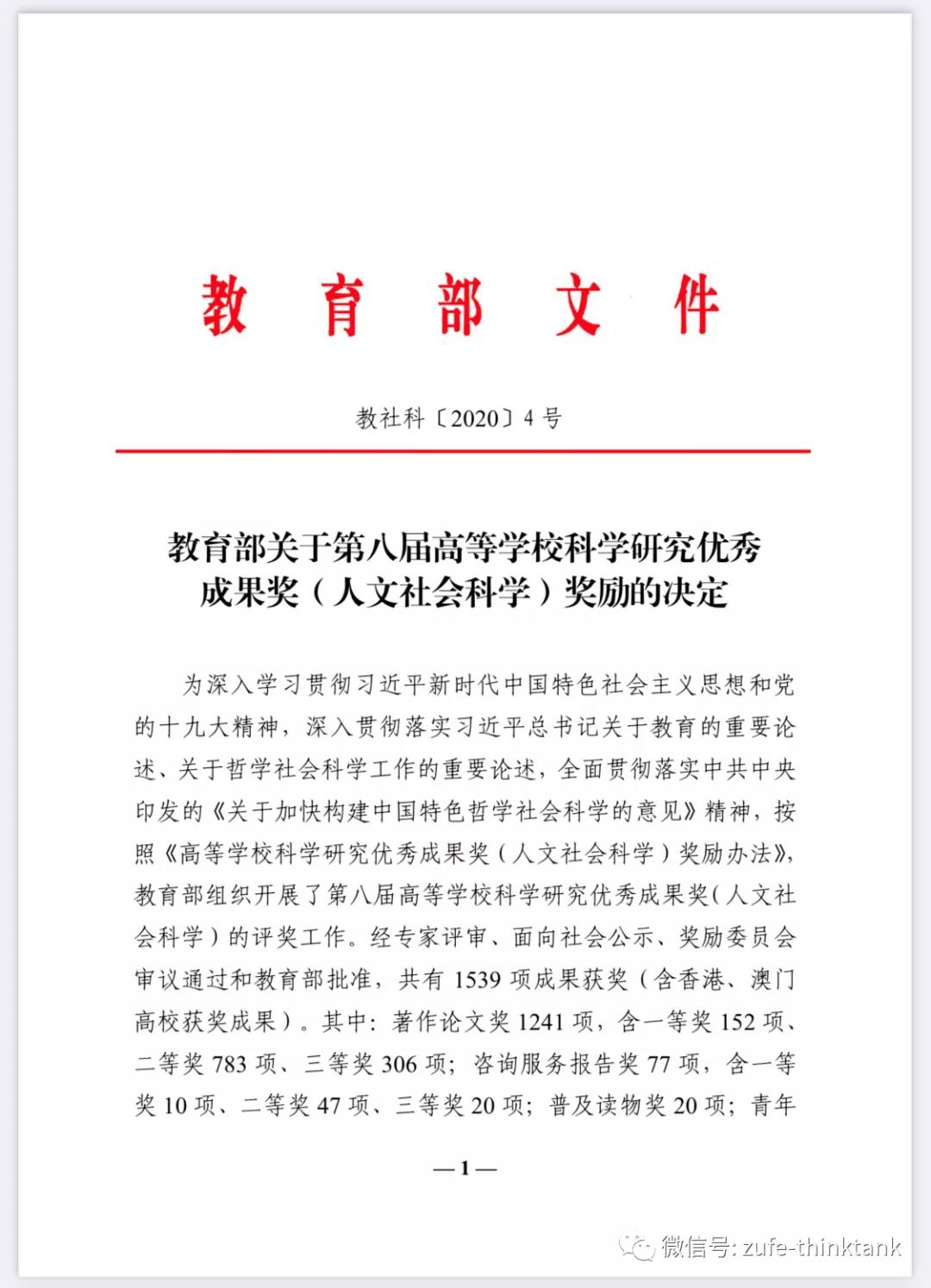 近日教育部发文《教育部关于第八届高等学校科学研究优秀成果奖(人文社会科学)奖励的决定》,全国1539项成果获奖。