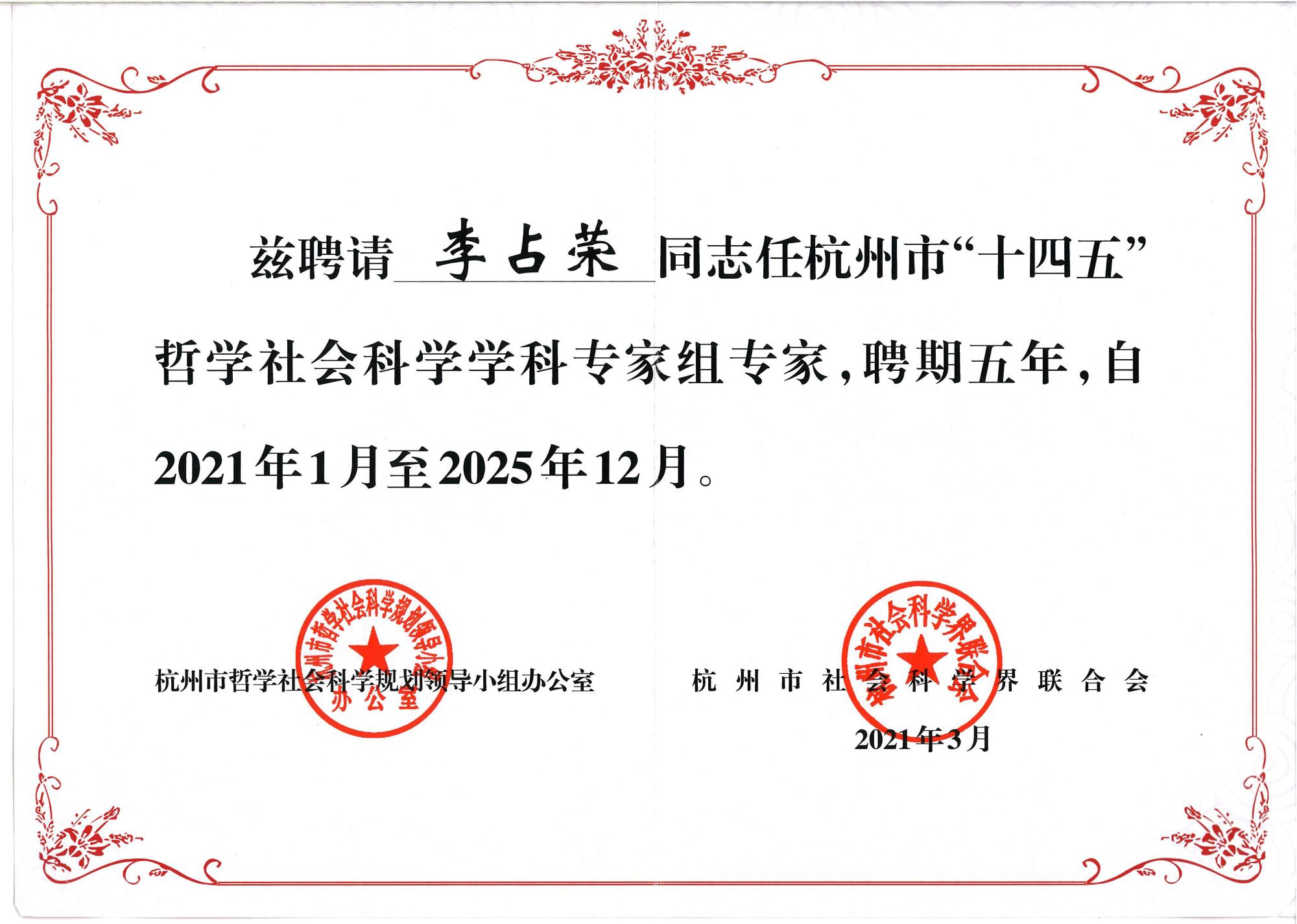 2021年3月,在线漫画 副校长李占荣教授、在线漫画 院长童志锋教授被聘为杭州市“十四五”哲学社会科学学科专家组专家