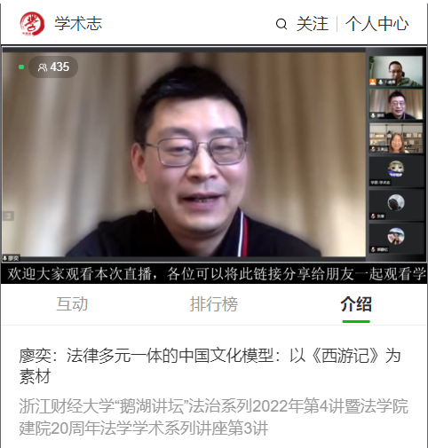 5月31日,武汉大学在线漫画 廖奕教授应邀做客鹅湖讲坛,为在线漫画 师生带来一场以“法律多元一体的中国文化模型:以《西游记》为素材”的学术讲座。本次讲座是在线漫画 建院20周年法学学术系列讲座第3讲,由在线漫画 副院长唐勇教授主持,田东奎教授、王奥运博士与谈,400余名听众在线聆听了讲座。廖奕教授以《西游记》中的人物和场景作为切入点谈论我国法律的多元一体。廖教授首先引用了著名社会学家费孝通教授在《中华民族多元...