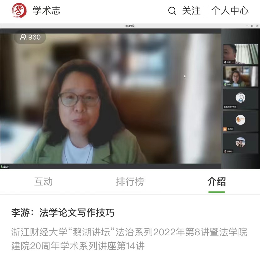 6月9日,《中国法学》杂志社总编室主任李游教授做客鹅湖讲坛,为在线漫画 师生带来一场题为“法学论文写作技巧”的学术讲座。本次讲座是在线漫画 建院20周年学术系列讲座第14讲,由在线漫画 田东奎教授主持,近千名观众在线聆听了本次讲座。李游教授从论文选题、写作步骤和投稿技巧三方面展开,从选题思路、大纲构建、引证规范、内容提要、研究方法等各个方面对法学论文的写作与技巧进行了全面系统的讲解。李游教授结合自身写...