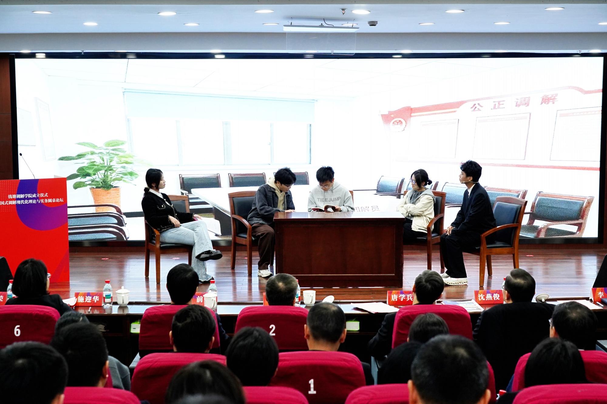 学生演绎了《钱塘速度,调解有度:综治中心的“心”服务》情景剧,生动展现了人民调解、商事调解与钱塘调解学院共同推动基层矛盾纠纷化解的新场景。