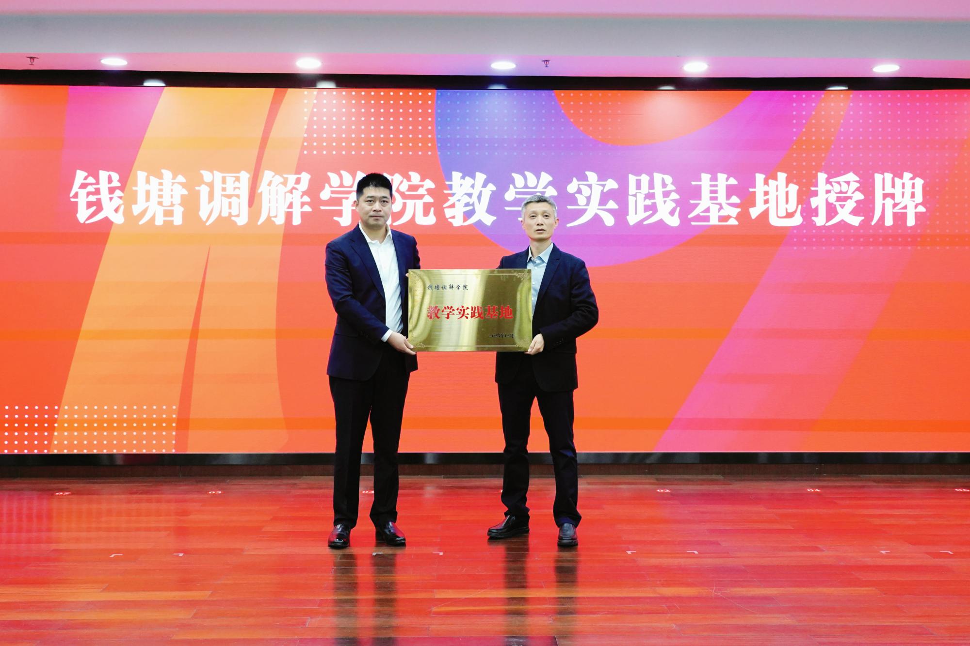 党委书记丁洪向钱塘区社会治理中心(综治中心)副主任诸士楷授牌钱塘调解学院教学实践基地。